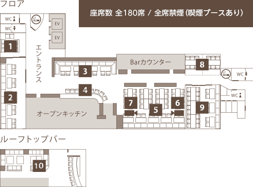 ルーフトップバーなど、 趣向をこらした180席をご用意しました。